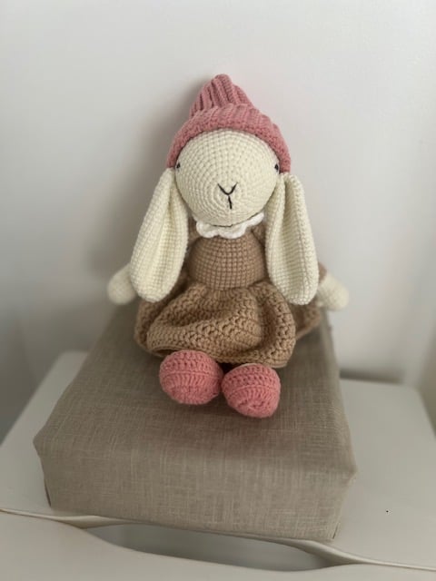 This 28 cm handmade crochet bunny wears a soft latte-colored dress, paired with a knitted pink beanie and matching booties. Her long floppy ears and stitched smile make her irresistibly huggable.