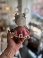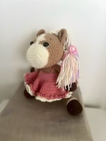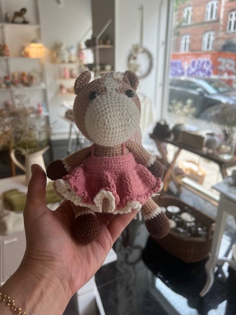 Lovingly crocheted by hand, she wears a soft pink dress with delicate white trim and a matching flower in her mane. At 24 cm tall, she’s the perfect size for little hands or for adding a touch of charm to a nursery shelf.