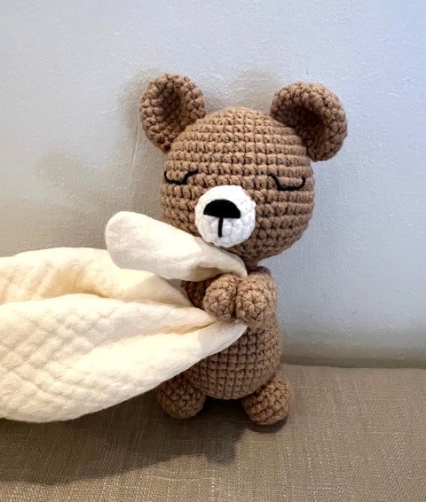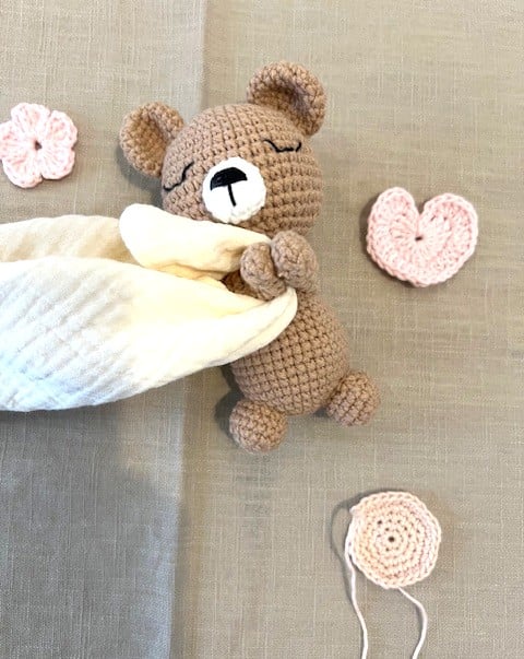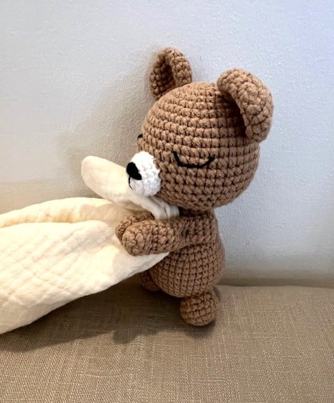 This sweet little bear is lovingly handmade using the Japanese amigurumi technique, where crochet stitches come together to create soft, expressive characters full of charm.