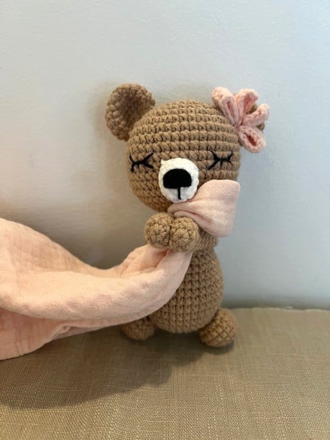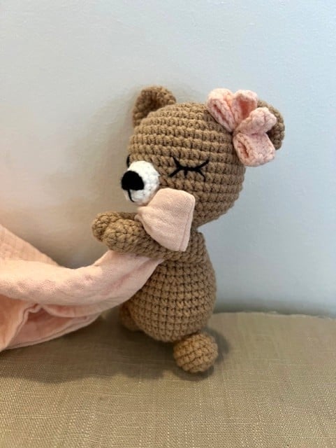 This sweet little bear is lovingly handmade using the Japanese amigurumi technique, where crochet stitches come together to create soft, expressive characters full of charm.