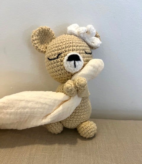 This sweet little bear is lovingly handmade using the Japanese amigurumi technique, where crochet stitches come together to create soft, expressive characters full of charm.