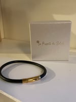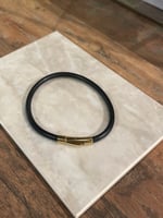 Sleek black leather with gold stainless steel ends. Simple, modern, and easy to wear every day.