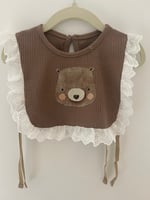A soft and adorable baby bib made from 100% cotton in a textured waffle fabric, finished with delicate lace edges for a charming touch.