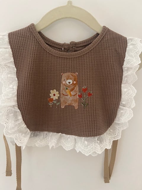 Brown Cotton Baby Bib with Bear, flowers and strawberries 🧸