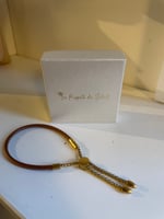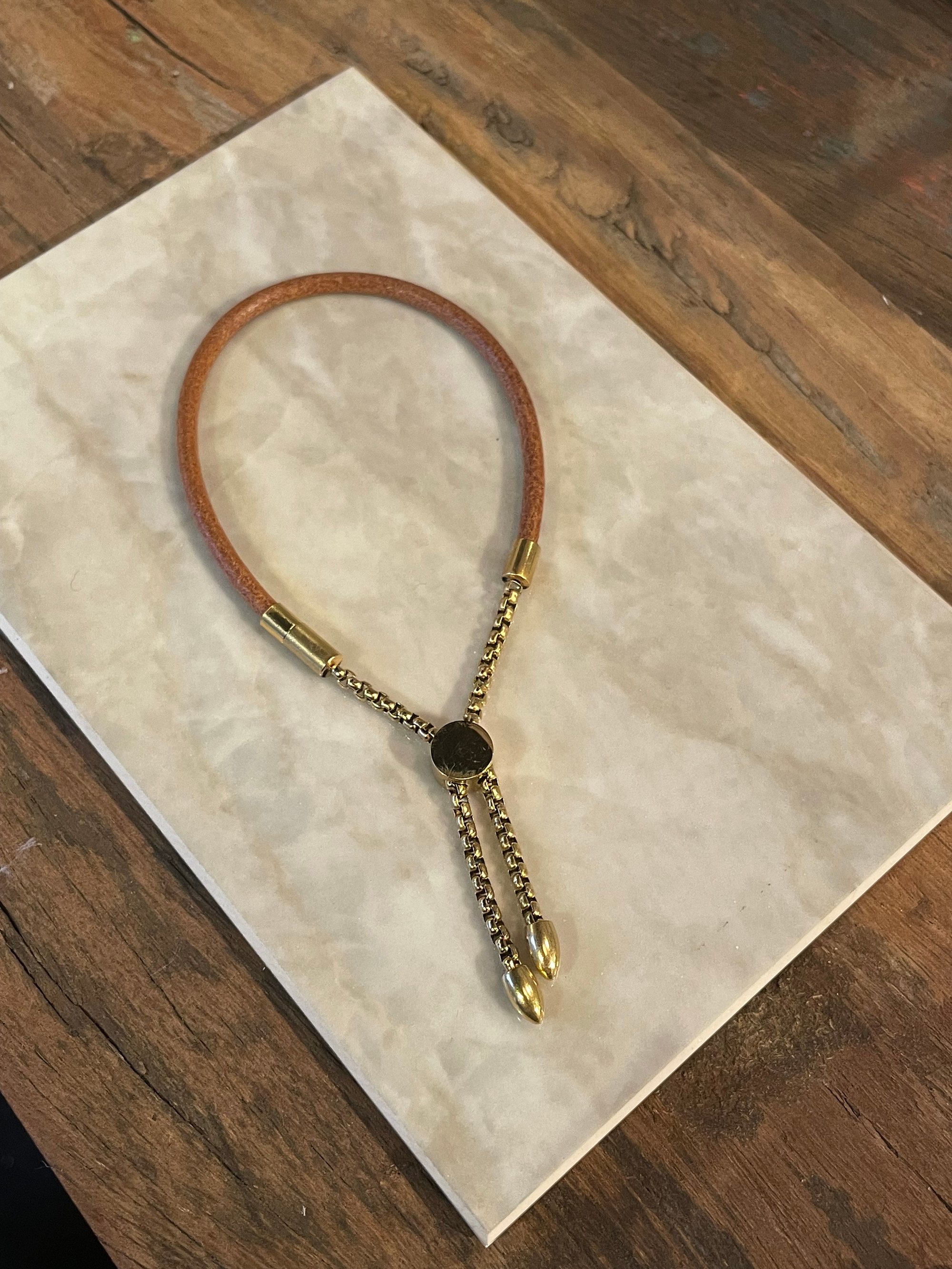 Brown leather cord with gold stainless steel details and a small charm. Casual and cool for any wrist.