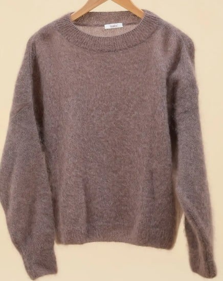 An airy and softly textured sweater crafted with 74% kid mohair, offering a light, cloud-like feel and gentle warmth. The relaxed silhouette and delicate halo give this knit an effortless elegance that works beautifully across seasons.