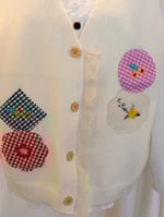 A delicate cotton knit vest in a soft, creme, decorated with charming hand-applied fabric motifs that make each piece subtly unique.