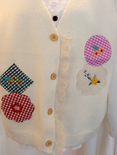 This vest blends a simple, timeless silhouette with playful artisanal details: carefully stitched patches, gentle textures, and a feminine lace trim along the button placket. Easy to layer over a blouse or dress, it brings warmth without heaviness and adds a touch of poetry to everyday outfits.