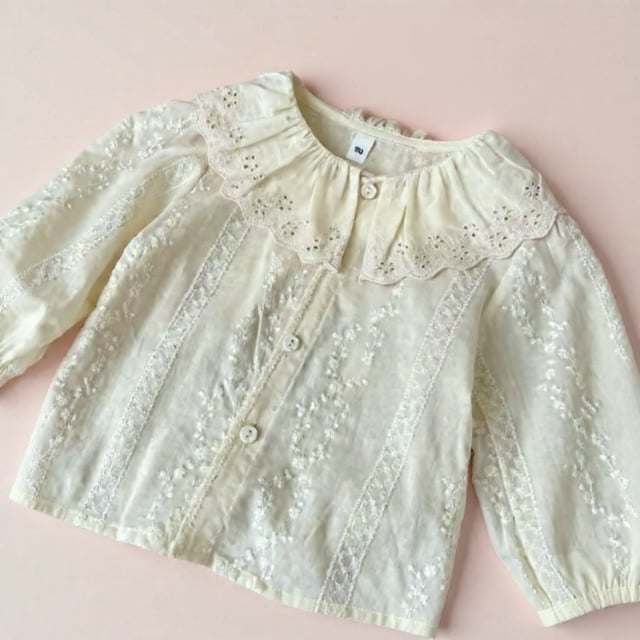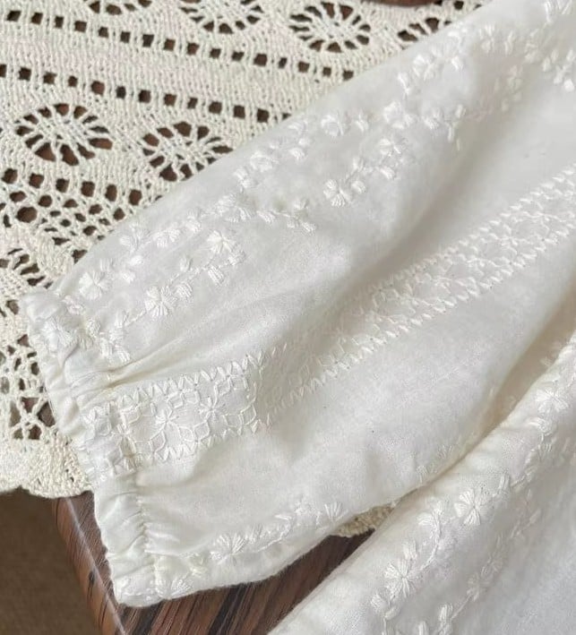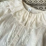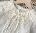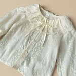 A delicate blouse crafted from 100% soft cotton. Featuring a charming ruffled collar, gentle elastic cuffs, and an all-over floral print in muted tones.