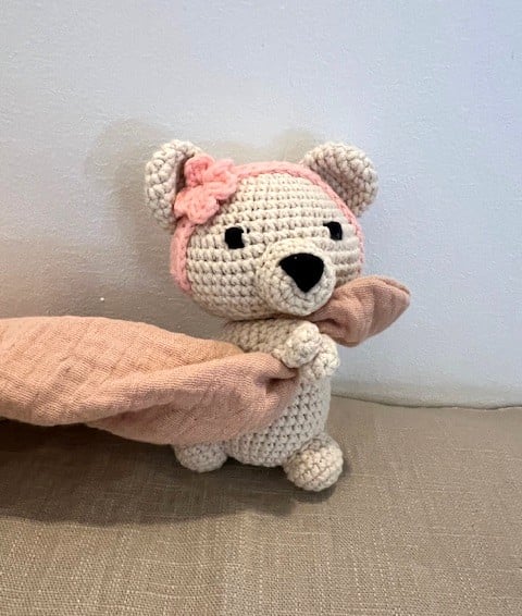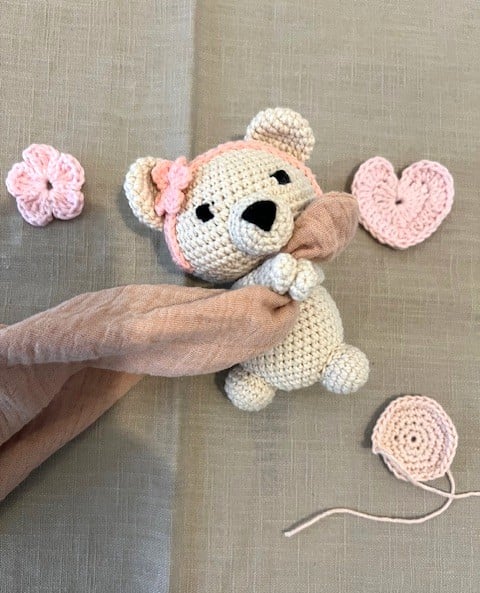 This sweet little bear is lovingly handmade using the Japanese amigurumi technique, where crochet stitches come together to create soft, expressive characters full of charm.
