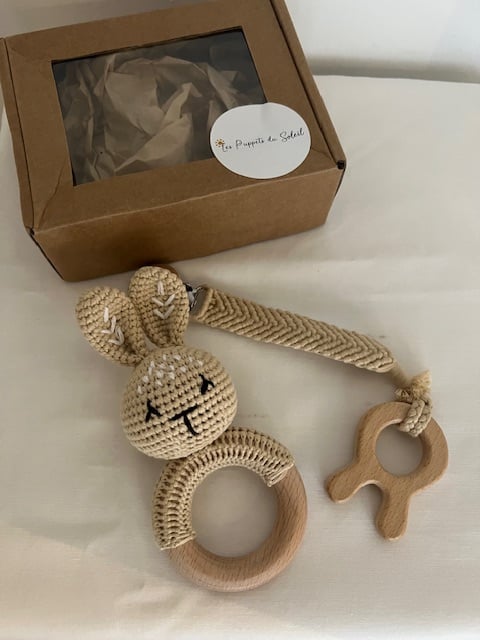 Each piece combines soft cotton crochet with smooth, untreated beech wood — safe for little hands and soothing for teething babies. Perfect as a thoughtful gift or keepsake, beautifully packaged in a Les Puppets du Soleil box.