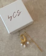Earring chain with large genuine freshwater pearls. The earring is made of 925 sterling silver and plated with 18 karat gold.