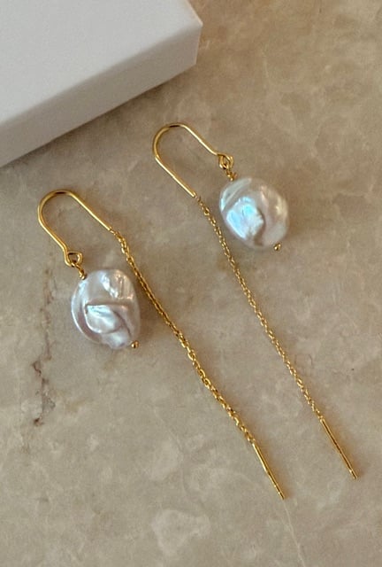 Earring chain with large genuine freshwater pearl. The earring is made of 925 sterling silver and plated with 18 karat gold.