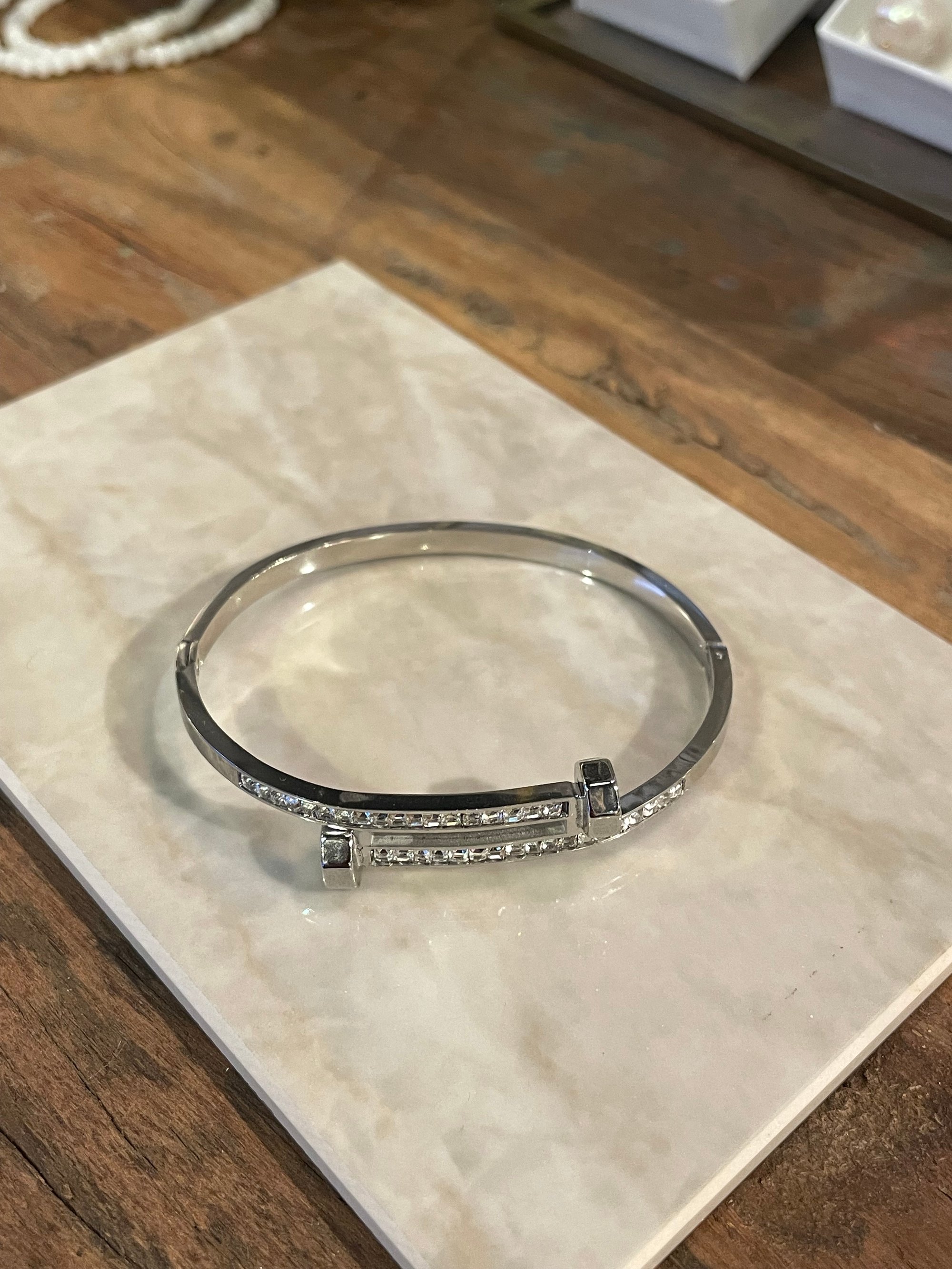 Sleek bangle with diamond-like nail details in stainless steel. Modern and subtle shine.