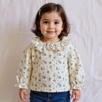 The blouse is made from 100% soft cotton with a delicate floral print. Its romantic ruffled collar and puffed sleeves give it a vintage touch that feels both classic and playful.