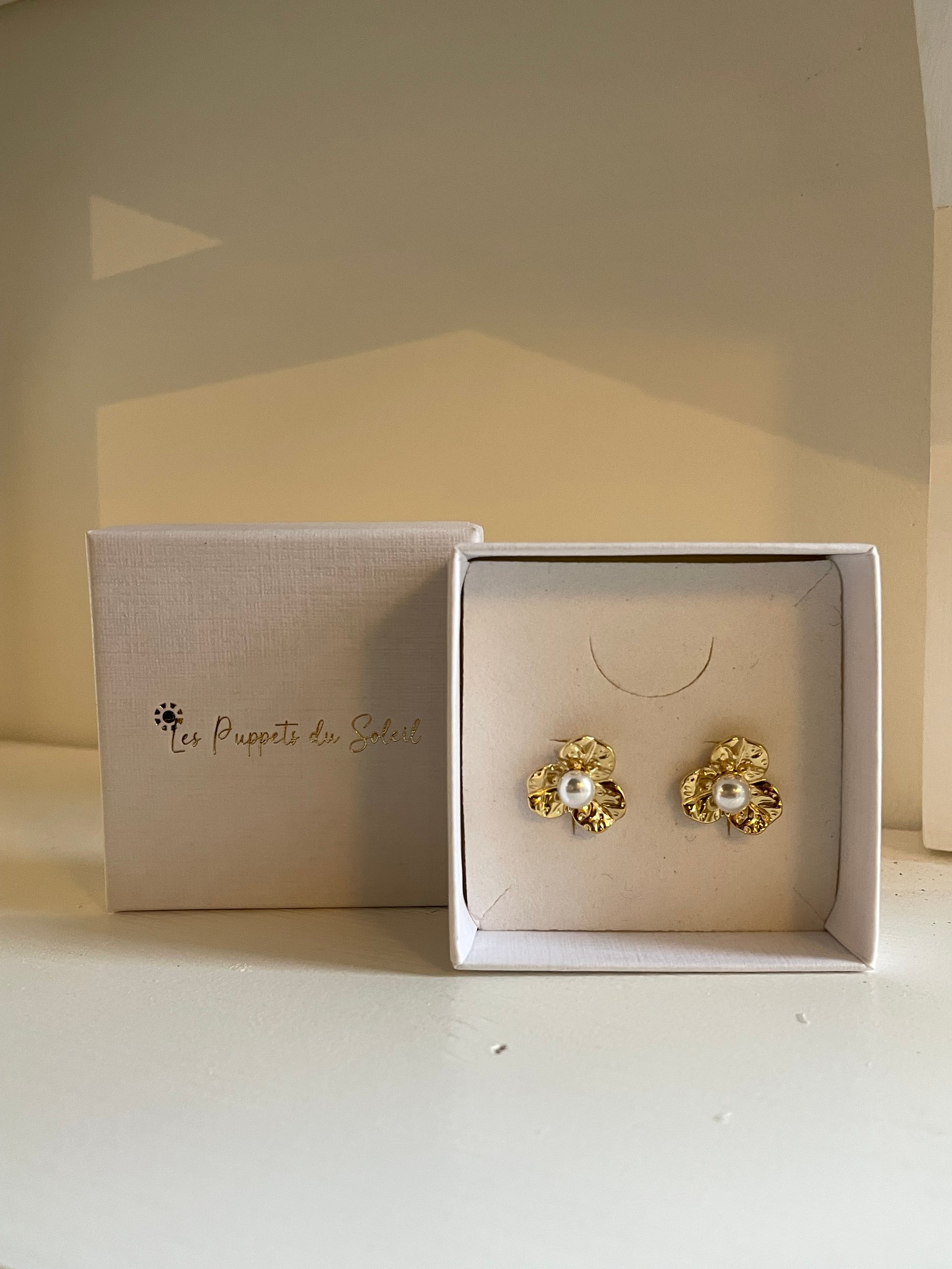 Lovely flowers with shiny pearls in gold stainless steel. Elegant and soft for everyday sparkle.