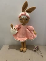 This charming crochet bunny is ready for twirls and cuddles! Dressed in a delicate pink dress with ruffled trim and a matching bow-topped hat, she brings warmth and joy to any little one's world.
