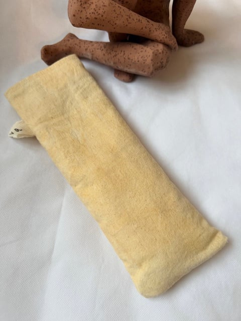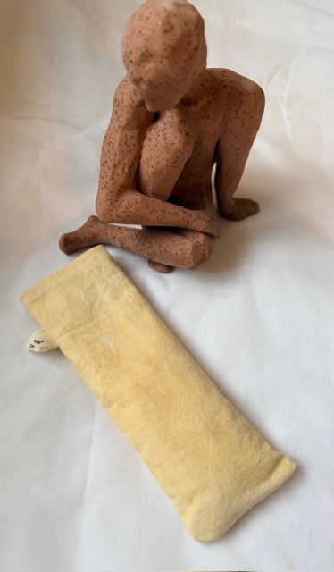 This soothing therapy pillow is crafted by hand with 100% cotton, gently stained using natural, eco-friendly products to create a unique, earthy hue. Filled with rice, chickpeas, seeds, and lavender. With a cotton cover dyed with natural color