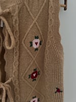 This charming vest is crafted from a soft wool blend, featuring a diamond-patterned knit with delicate embroidered floral motifs. The flowers in soft pinks and reds with green leaves add a cheerful touch to the warm beige background.