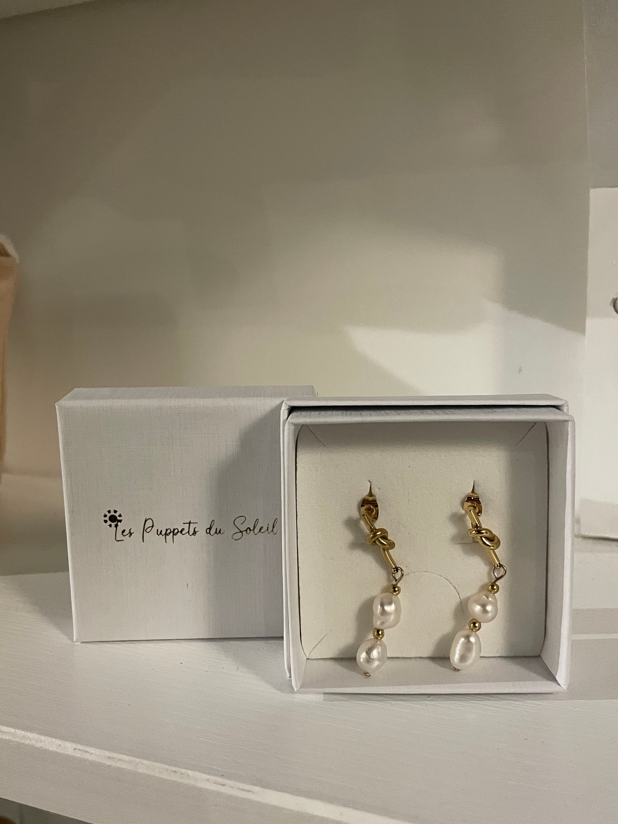 Graceful pearl drops suspended from golden stainless steel, offering a romantic sway with every move. These are your go-to for subtle sophistication.