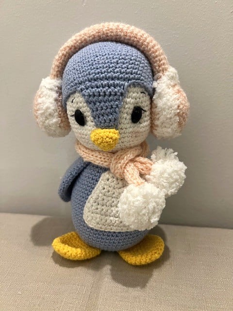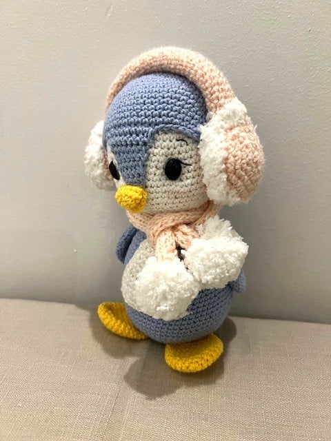 Pippa is a cozy little penguin who loves winter days and soft snowfall. Wrapped in her fluffy earmuffs and warm scarf, she’s always ready for a gentle walk or a quiet moment indoors. Her rounded shape, soft colors, and delicate details make her especially comforting to hold.
