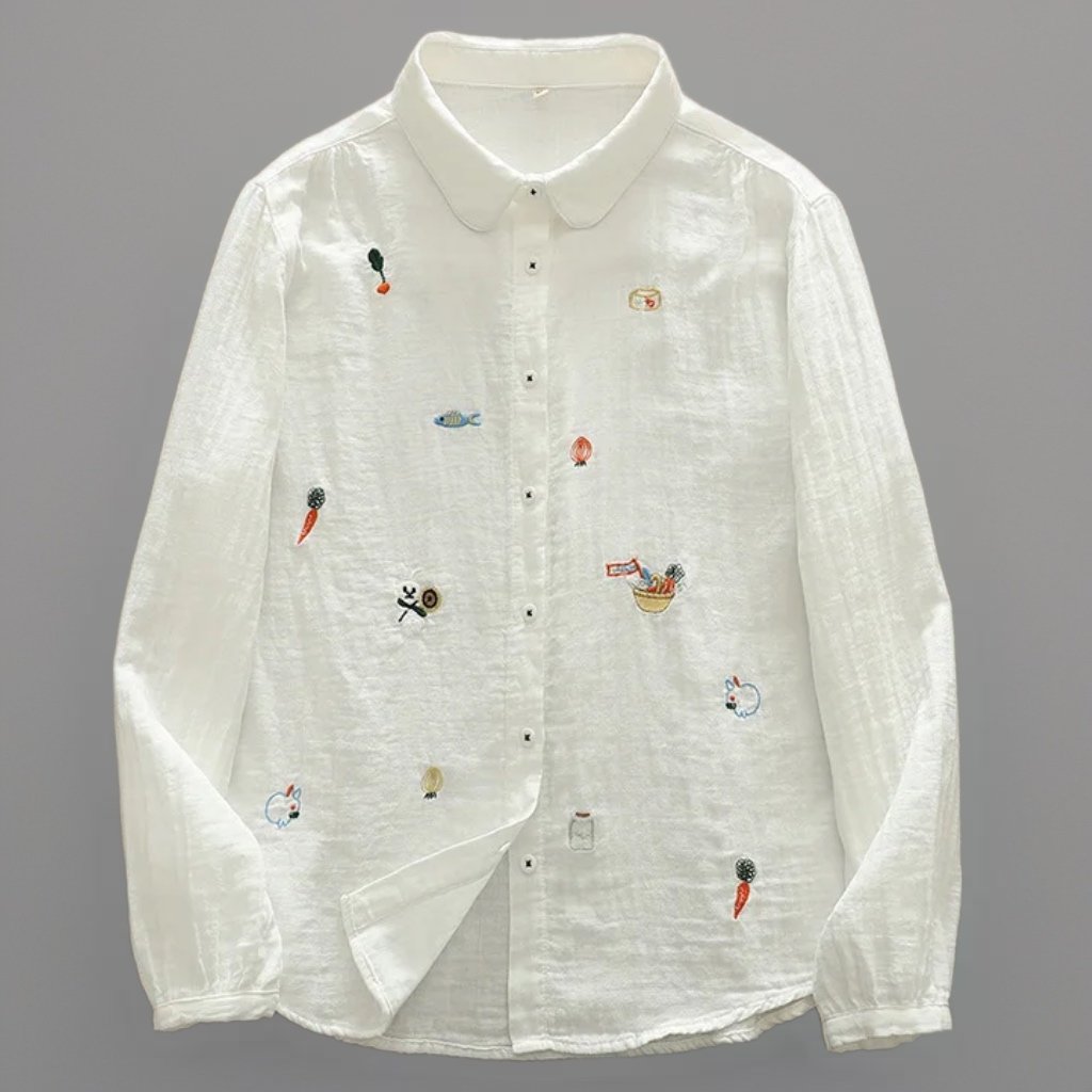 A light and breathable 100% cotton shirt, decorated with delicate embroidered motifs that bring charm and playfulness to a timeless design. With its classic collar, button-down closure, and relaxed fit, this shirt combines everyday comfort with unique detailing.